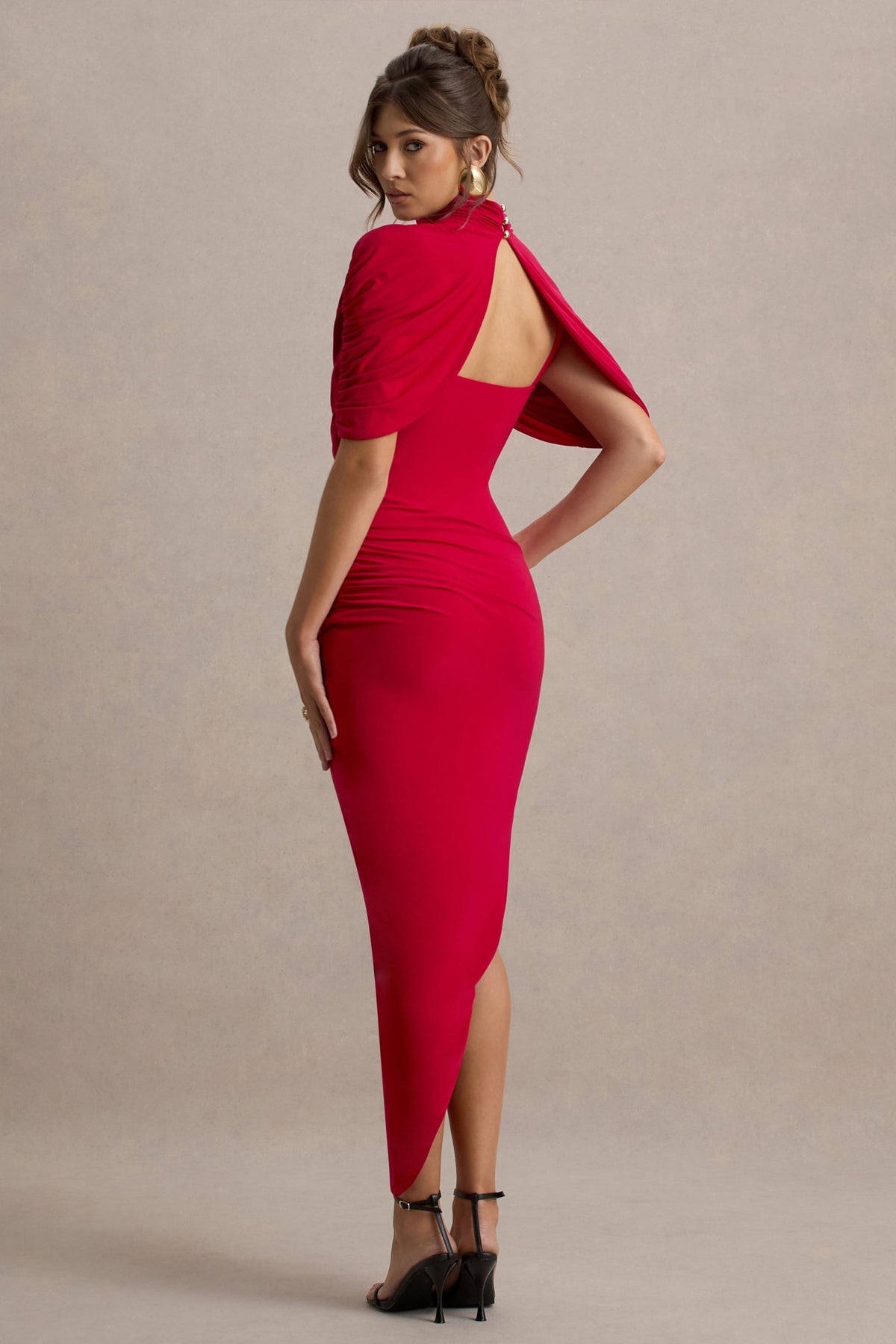 Rafinament și glamour pur cu rochia noastră Taylor Maxi Fabricată dintr-un jersey elastic de înaltă calitate, de un roșu vibrant, această rochie îți pune în valoare silueta din orice unghi. Decolteul înalt și mânecile de tip pelerină o fac piesa perfectă pentru o ocazie elegantă. Combin-o cu cercei statement pentru un look deosebit.